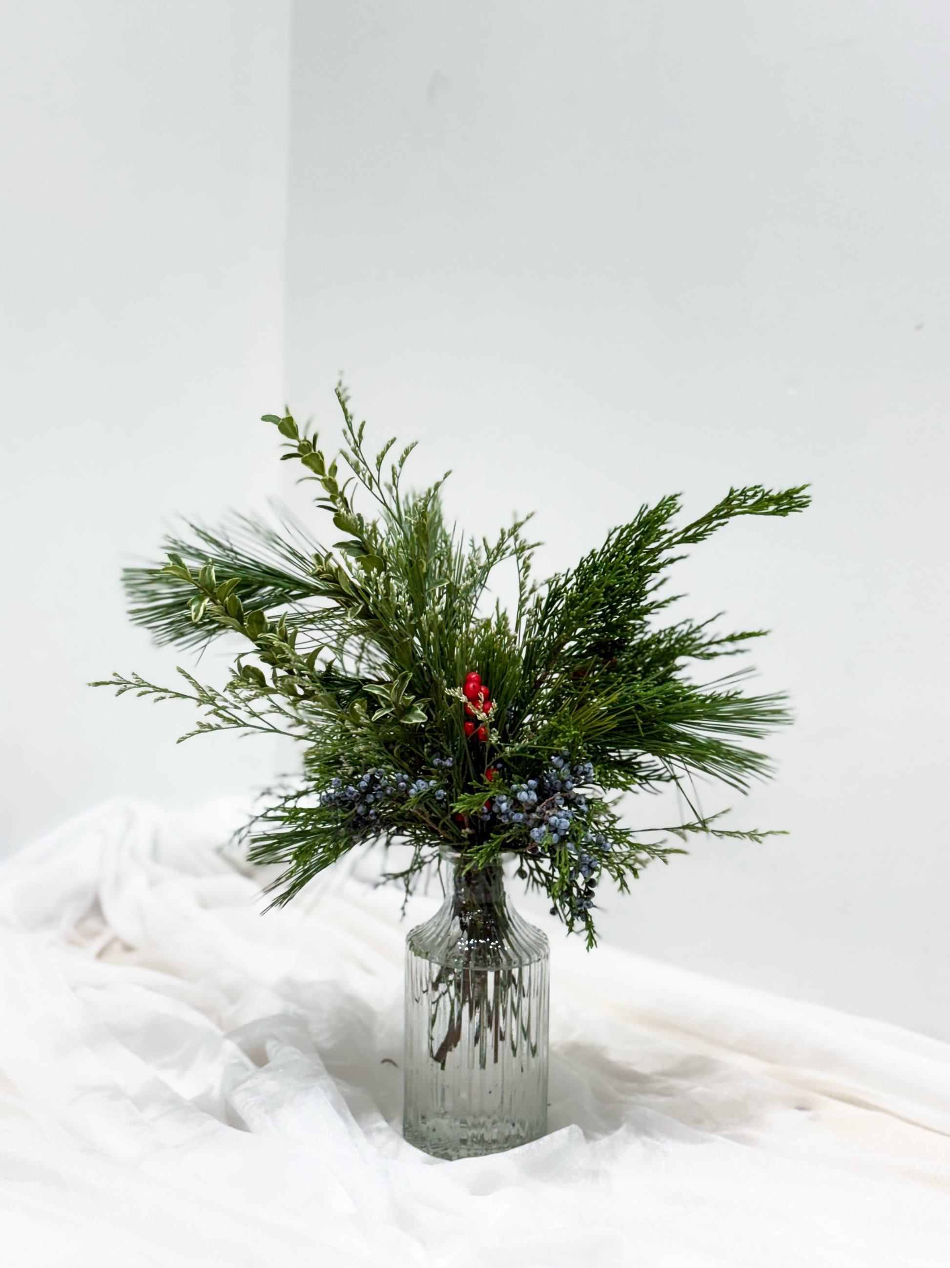 Artfully nestled into our Frosty White Bud Vase, this charming arrangement mixes lush greenery with the sweetness of woodland blueberries to uplift any spirit during the holidays.