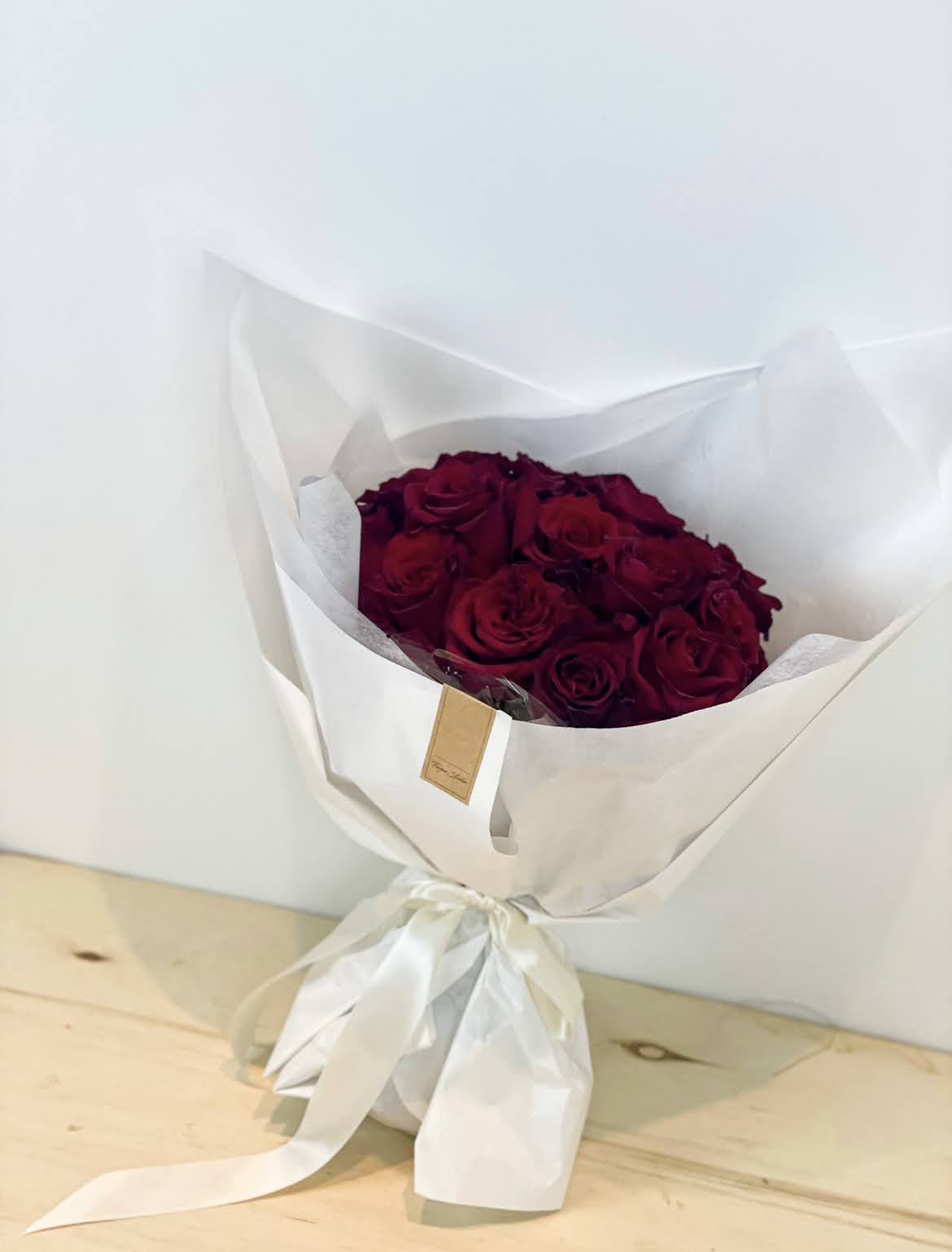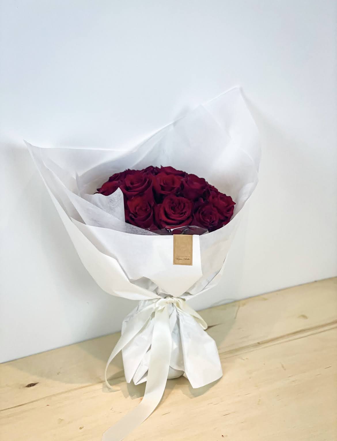 A hand tied Red roses wrapped in a custom White wrapping paper with a White ribbon.